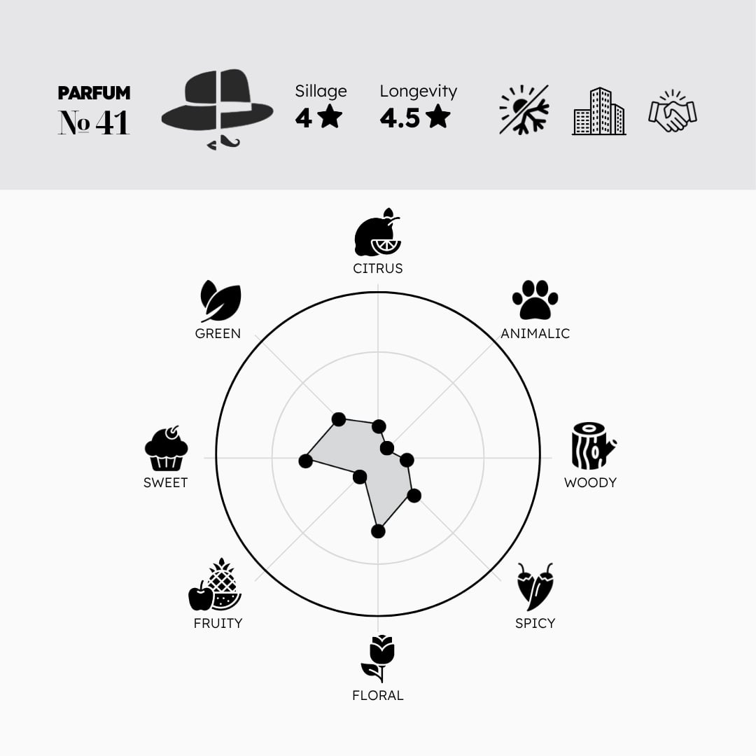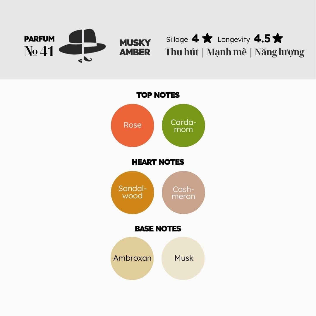 №41 là dấu hương thuộc nhóm Musky Amber, với ambroxan là thành phần nổi bật ở base note. Mọi người yêu thích nước hoa có thành phần Ambroxan vì hương thơm clean và fresh, nhẹ nhàng như second-skin. Khi №41 dry down, dấu hương càng về sau càng cuốn hút nhờ ambroxan kết hợp với musk ở tầng hương cuối. №41 vẫn luôn trong top selling của Morra nhờ cân bằng giữa sự nhẹ nhàng nữ tính và nguồn năng lượng thu hút ẩn chứa trong dấu hương.