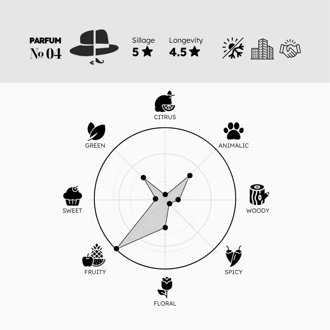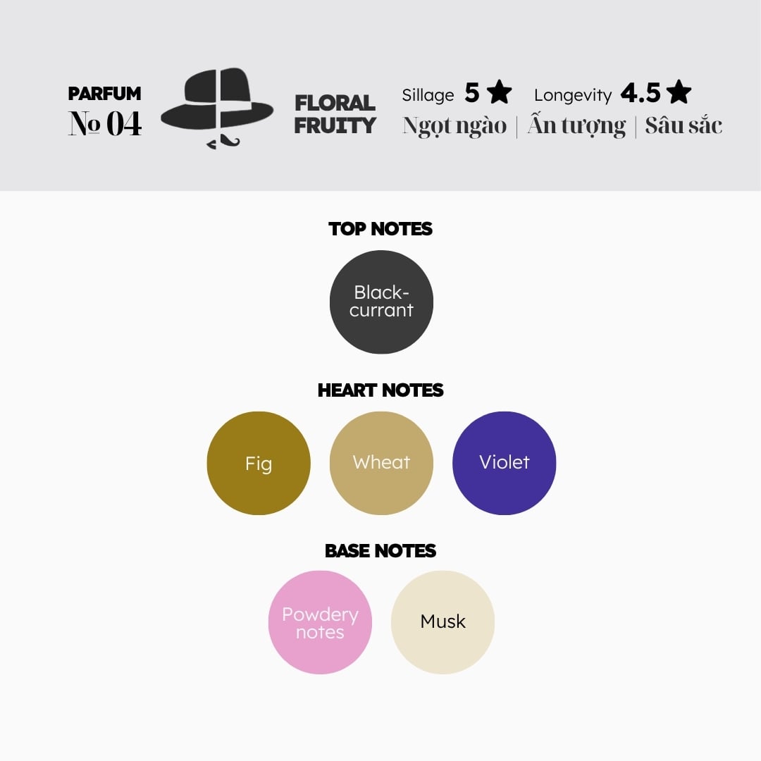 № 04 mang đến sự ngọt ngào, mềm mại và một chút phấn. Nổi bật với note Wheat (lúa mì) nhẹ nhàng ở tầng hương giữa, giúp cân bằng sự tươi mát của hương hoa và trái cây. Một lựa chọn hương thơm đơn giản nhưng vẫn đủ sang trọng cho các quý cô lẫn quý ông trong ngày hè.