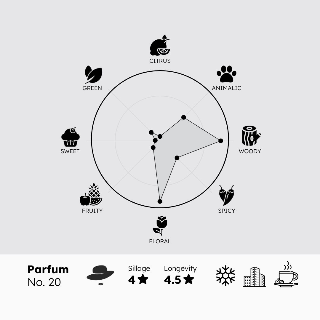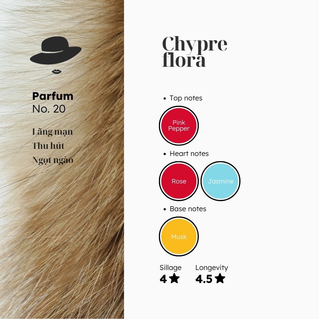 № 20 là một dấu hương mới mẻ và ngọt ngào. Bạn sẽ bất ngờ khi bắt gặp note Pink Pepper với một chút cay nồng ngay tầng hương đầu. Đây là một bản hòa âm được tạo nên từ các note hương đơn giản nhưng lại mang đến cho bạn vẻ rực rỡ và dịu dàng. Nếu bạn sở hữu nét quyến rũ độc đáo thì No.20 sẽ là lựa chọn hoàn hảo.