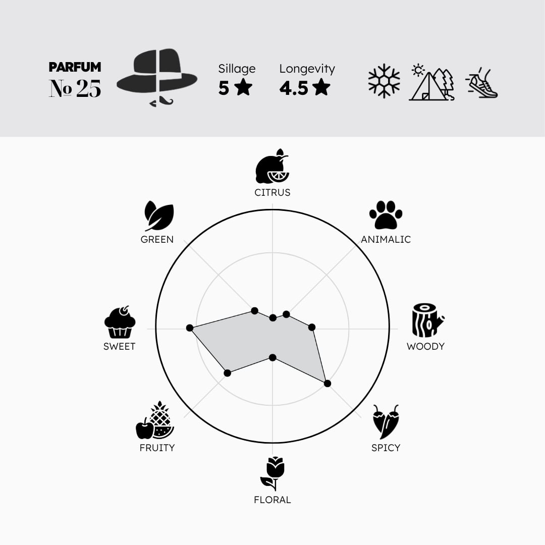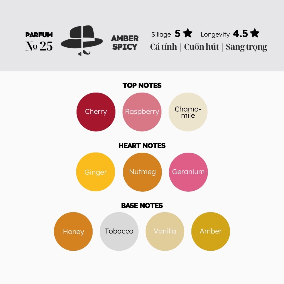 Ẩn trong dấu hương đầy cuốn hút như № 25 chính là sự kết hợp hoàn hảo của hương thơm trái cây tươi mọng và những nốt hương hoa ngọt ngào. Tưởng như chỉ có thể gây ấn tượng bằng sự quyến rũ đơn thuần cho tới khi sự xuất hiện của tầng hương cuối: nhục đậu khấu và gừng già cay ấm quyện với tobacco cá tính cùng lan tỏa trong nền hương mượt mà của vani. Với nét đặc biệt và tinh tế của những tầng hương trên, không hề ngạc nhiên khi № 25 chính là một trong những dấu hương “danh giá” nhất nhà Morra.