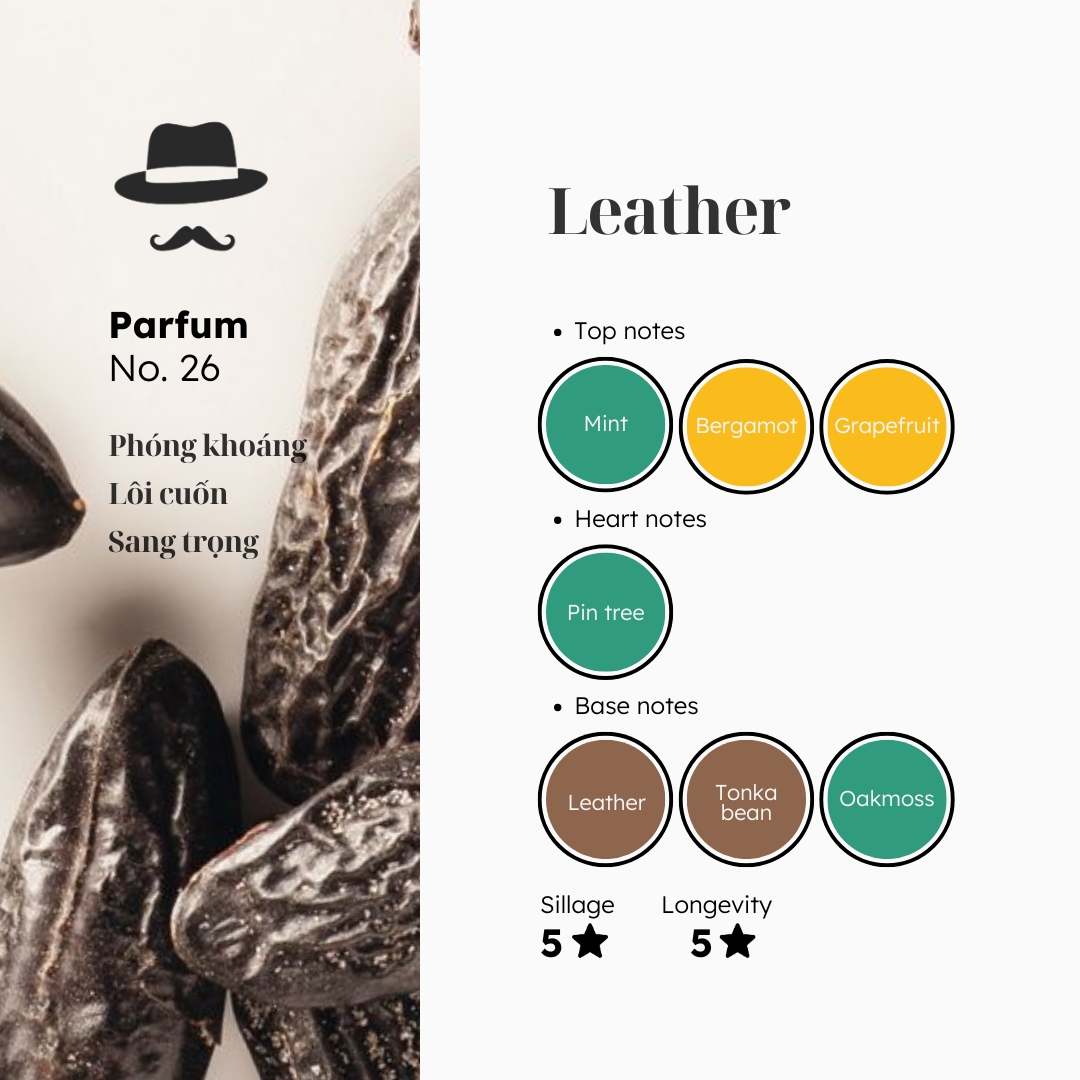 - Base: Leather (da thuộc), Tonka Bean (đậu tonka), Oakmoss (rêu sồi)
