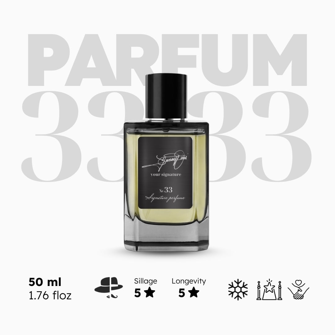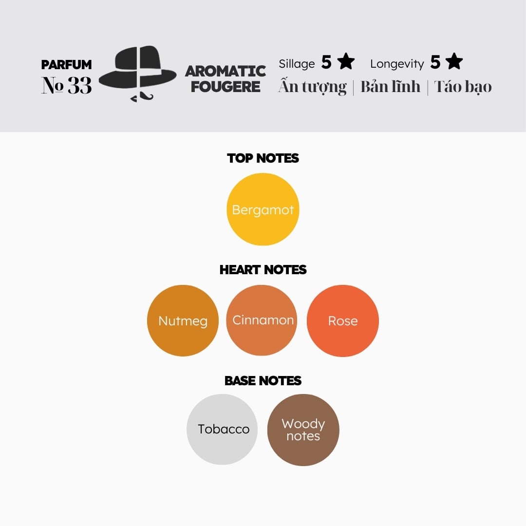 № 33 là dấu hương thuộc nhóm Fougere - một trong những nhóm hương lâu đời và đắt giá nhất của thế giới nước hoa - bởi sự cân bằng hoàn hảo giữa nét tươi mát, tinh tế và chiều sâu sang trọng.
