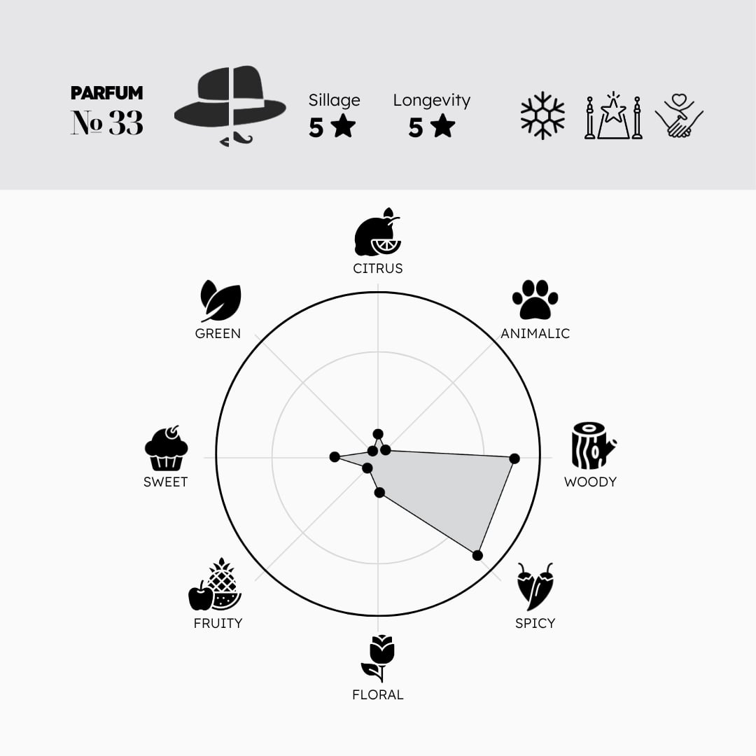 Điểm độc đáo của № 33 nằm ở sự xuất hiện của note rose trong heart note, ngay bên cạnh là note nutmeg và cinnamon thuộc gia đình các note hương Spicy (các note gia vị). Note rose trong № 33 không mang đến vị ngọt ngào thuần túy, mà trở thành nốt hương cân bằng giúp làm mềm lại vị cay nồng của hạt nhục đậu khấu và quế. Chính vì sự kết hợp độc đáo này nên tổng thể mùi hương của № 33 vừa tươi mát ban đầu, lại vừa ấm áp vừa thanh lịch về sau.