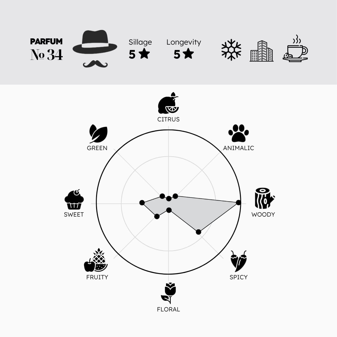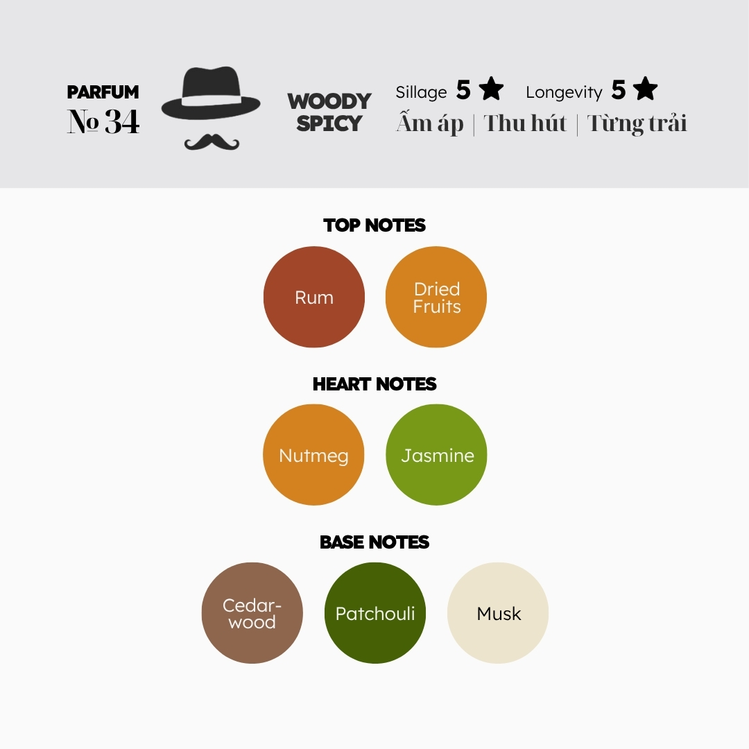 №34 là dấu hương được Morra ra mắt năm 2023, thuộc nhóm Woody Spicy luôn được ưa chuộng bởi sự ấm áp và chiều sâu trong tổng thể mùi hương. Top notes của №34 vô cùng độc đáo khi note rum (rượu rum) được perfumer kết hợp cùng dried fruits (trái cây khô), mang đến hương vị ngọt ngào và đậm đà, khiến liên tưởng đến hương vị gourmand cao cấp. Với sự sang trọng và chiều sâu tinh tế đặc trưng, №34 sẽ là lựa chọn hoàn hảo cho những dịp đặc biệt và các buổi tiệc cuối năm của những ai có gu thưởng thức tinh tế, am hiểu cả trong lĩnh vực nước hoa lẫn ẩm thực fine dining.